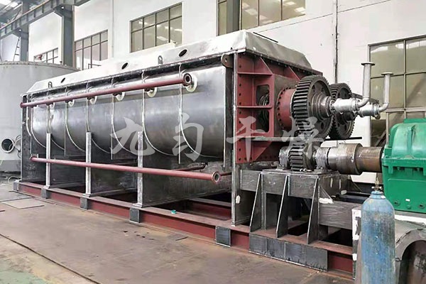 空心轴上密集排列着楔型中空桨叶,热介质经空心轴流经桨叶。单位有效容积内传热面积很大,热介质温度从-40℃到320℃,可以是水蒸汽,也可以是液体型:如热水、导热油等。间接传导加热,没有携带空气带走热量,热量均用来加热物料。热量损失仅为通过器体保温层向环境的散热。楔型 桨叶传热面具有自清洁功能。物料颗粒与楔型面的相对运动产生洗刷作用,能够洗刷掉楔型面上附着物料,使运转中一直保持着清洁的传热面。桨叶干燥机的壳体为W型,壳体内一般安排二到四根空心搅拌轴。壳体有密封端盖与上盖,防止物料粉尘外泄及收集物料溶剂蒸汽。出料口处设置一挡扳,保证料位高度,使传热面被物料覆盖而充分发挥作用。热介质通过旋转接头,流经壳体夹套及空心搅拌轴,空心搅拌轴依据热介质的类型而具有不同的内部结构,以保证好的传热效果。